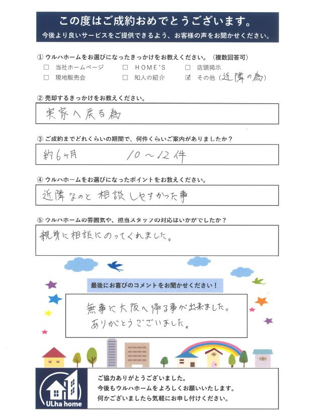 T様、この度は数多くある不動産の中から弊社をご利用いただきまして、誠にありがとうございました! 当初は売却するか、賃貸募集するかお悩みでしたが、売却の決断をいただき、お引渡しまでご希望の期間内で無事に契約~引渡しまで終わり良かったです! 朝早くからのご案内に何度もご協力いただけたのが功を奏したのかと思います! これからご実家に戻られての新生活でのご活躍をお祈りしております!\(^_^)/ 川越祭りなどでお近くにお越しの際は、ぜひ遊びにお越し下さい! 最後になりますが、この度はご成約本当におめでとうございました!