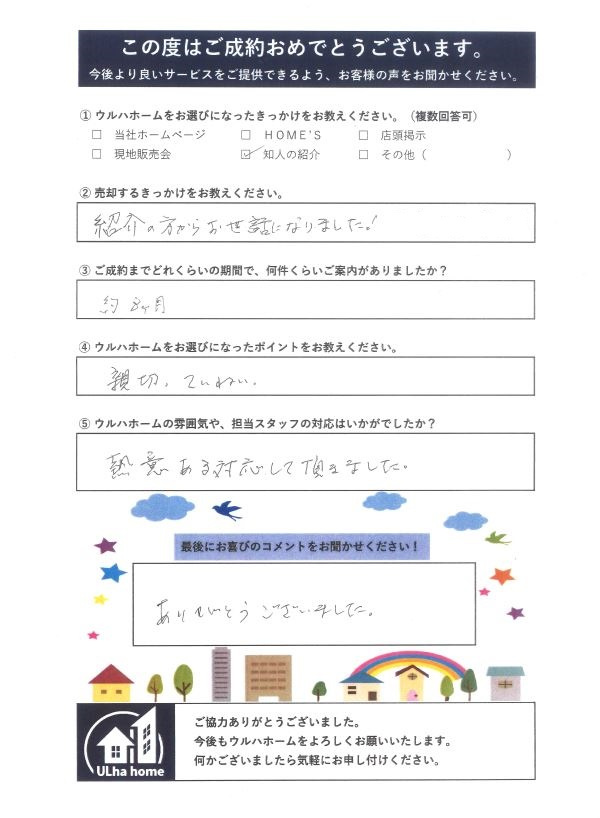 K様、この度は知人のご紹介から弊社をご利用いただきまして、誠にありがとうございました! 当初は賃貸募集のご相談でしたが、売却へと方向を切り換えて、ご契約~お引渡しまで、何とか無事に終わり良かったです! 今回は細かなことが数多くあり、お手数おかけしたり、なかなかご理解が難しかったとは思いますが、ご協力ありがとうございました! 私自身としても、今回は勉強させて頂くことが多く、不動産屋としても成長させて頂きました!ありがとうございます。 また、色々な差し入れを頂戴して嬉しかったです! 最後になりますが、この度はご成約本当におめでとうございました!