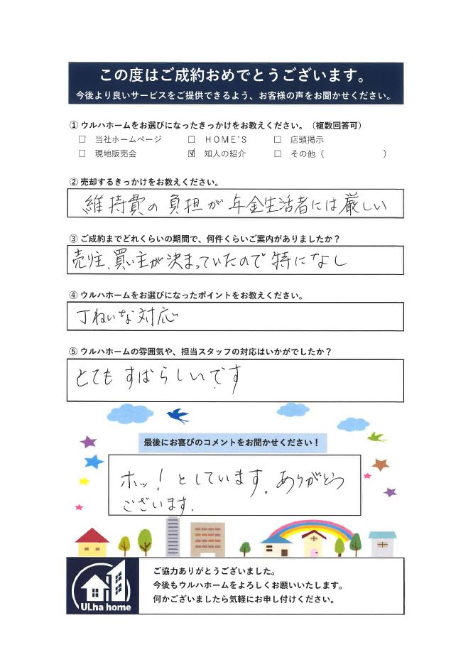 Y様、この度のご売却ではご紹介から弊社をお選びいただきありがとうございました。 利用していない物件の維持費はもったいないので、今回のご売却は正解だったと思います。 買主様が決まっていたことから、特に問題もなくスムーズにお取引でき、大変うれしく思っております! 改めましてこの度は、本当にありがとうございました。 Y様のご健勝とますますのご活躍をお祈り申し上げます。