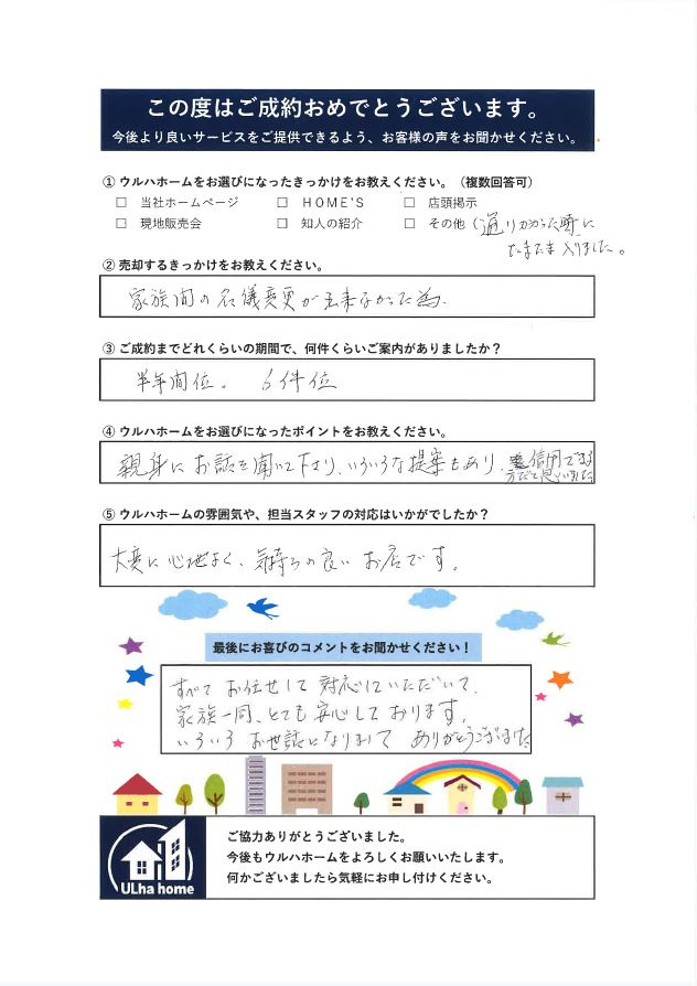 Y様、この度は数ある不動産会社の中から弊社をご利用いただきまして、誠にありがとうございました! ご相談・査定から始まり、契約・引渡しまで無事に終わりおめでとうございました。 契約が決まってからは、日程的に厳しいところ色々とご協力いただき大変助かりました! また、いつも美味しい差し入れを頂戴して嬉しかったです!紅マドンナは忘れられません(*^_^*) 今後ご購入のタイミングが来ましたら、ぜひ弊社にお声かけいただければ幸いです! 最後になりますが、この度はご成約本当におめでとうございました!