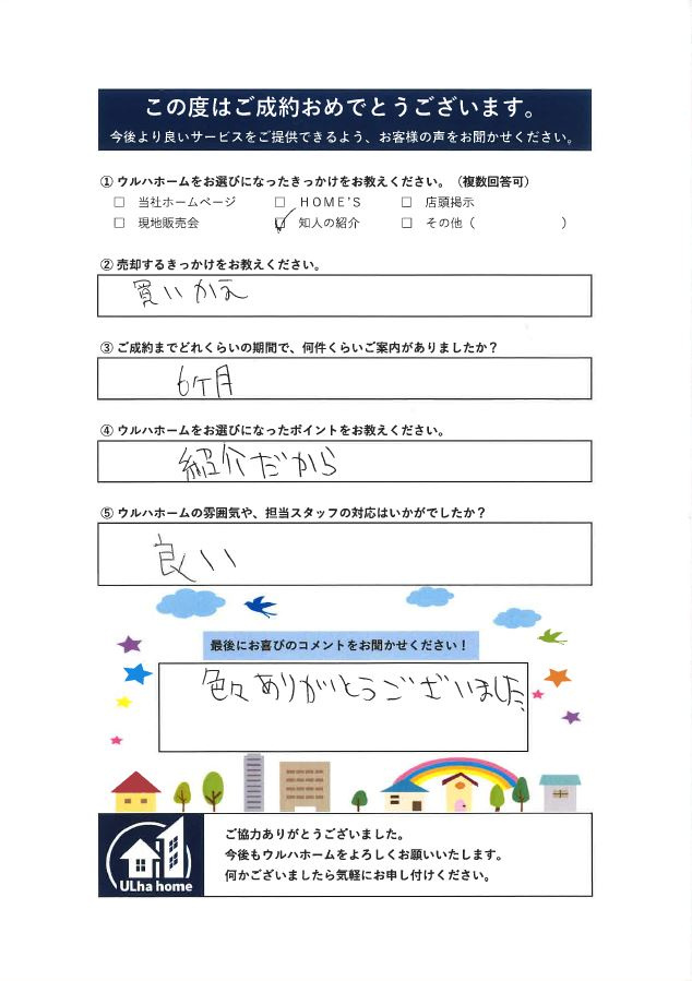 M様、ご紹介から始まり、査定~ご成約まで誠にありがとうございました! ご希望の金額(査定金額とも一致)でのご売却ができましたので、こちらも一安心でした\(^_^)/ 半年の売却期間も当初お話しした3~6ヶ月程度で、だいたい予定通りだったと思います。 契約時には少しお手間を取らせてしまいご迷惑をおかけしてしまいましたが、無事に引渡しおめでとうございます! 他の新たなお話しもいただきましたので、引き続き精一杯頑張らせていただきます! 最後になりますが、この度はご成約本当におめでとうございました!