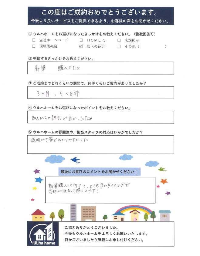 新築購入に向けて、とても良いタイミングで売却が決まって嬉しいです!